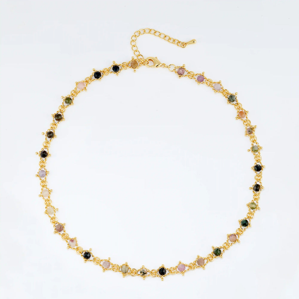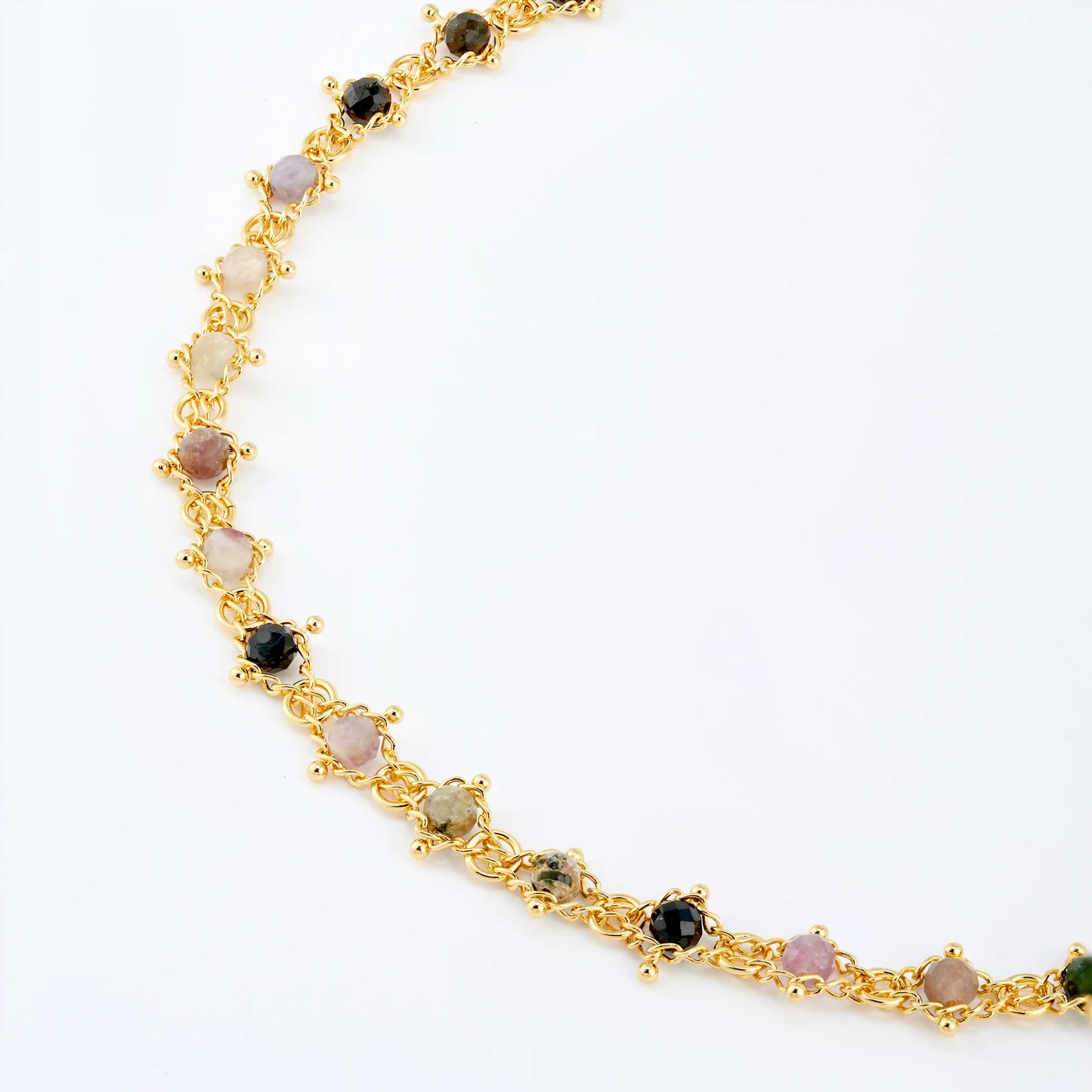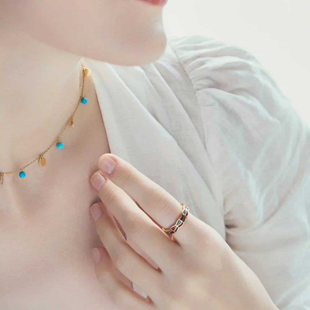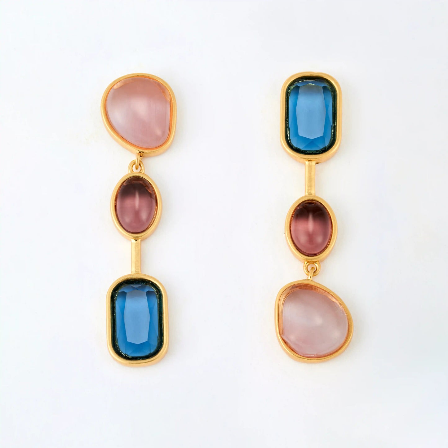These gold chain gemstone earrings bring together three natural stones in deep navy, cherry red, and soft pink—each one shaped differently, each...